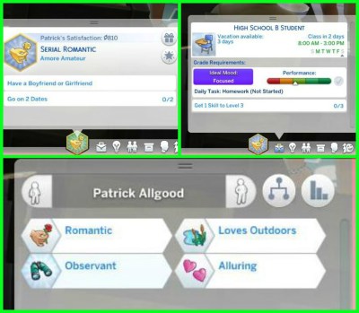 Patrick has the Serial Romantic lifetime aspiration and is currently a high school student. I have tried my teenage sims with a job and school, but that was next to impossible because their needs always dropped so rapidly so, until Patrick graduates he will remain unemployed.